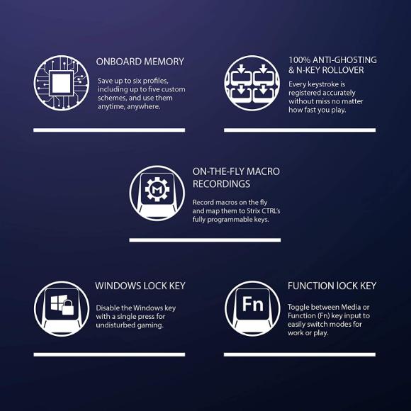 AURA SYNC – Vibrant per-key backlighting illuminates Strix Scope from top to bottom and edge to edge. Powered by Aura Sync, the entire color spectrum and a range of dynamic lighting effects are at your command for you to create a keyboard that’s uniquely yours. The lighting is easily synced with the extensive Aura ecosystem to create a gaming environment that really shines.