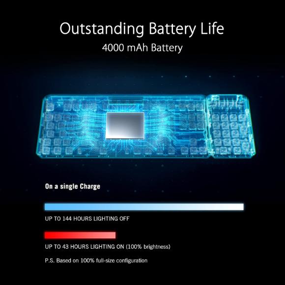 • FAST CHARGE OR USB PASSTHROUGH – 30 minutes of USB-C fast charging* allows ROG Claymore II to be operated for up to 18 hours (lighting off). The fast-charge function can be switched off to use the provided USB passthrough for convenient connection to other devices.