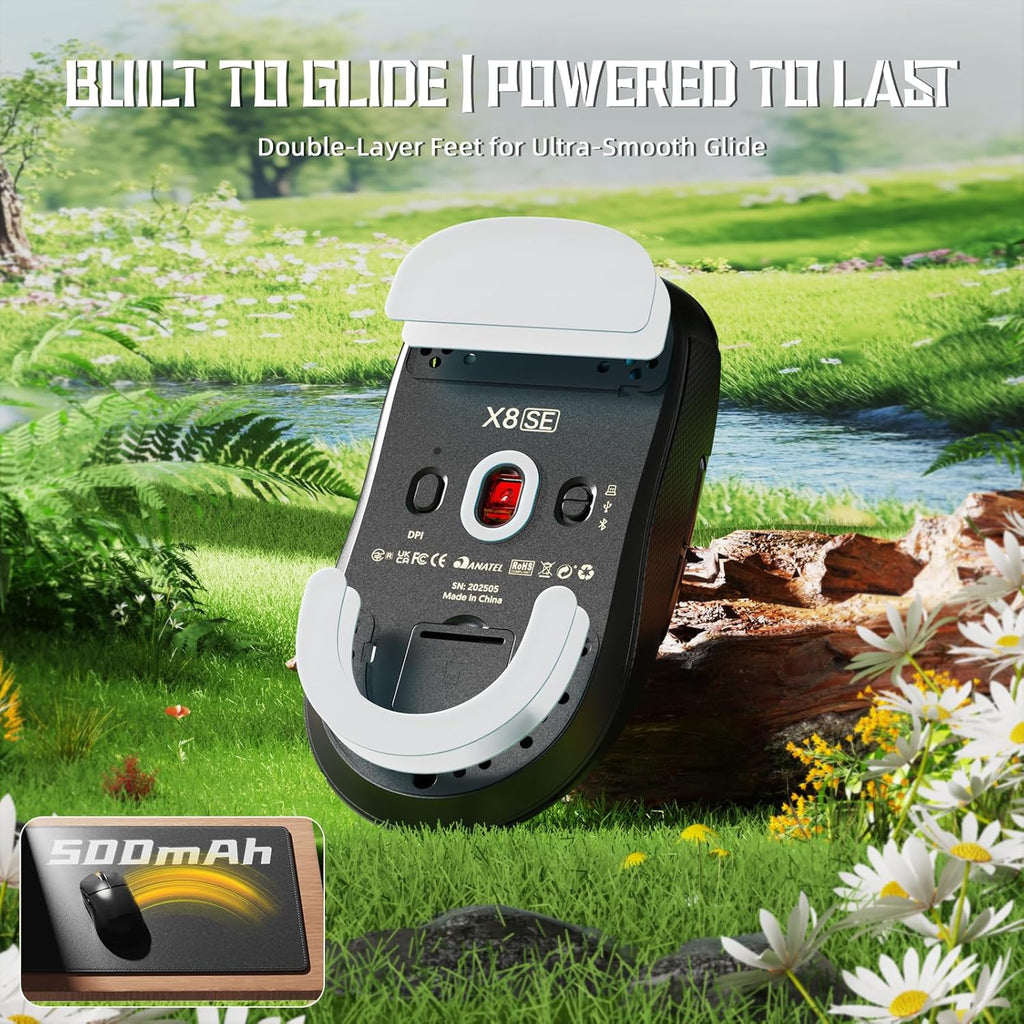 • 【Tri-mode Connectivity】Stay Connected, Stay Unbeatable - The X8 SE ergonomic mouse seamlessly switch between Bluetooth, 2.4GHz wireless, and wired USB connections. This computer mouse delivers incredible responsiveness and reliability with a super-fast 0.3993ms actuation with no debounce delay, enjoy reliability and speed that outshines others.