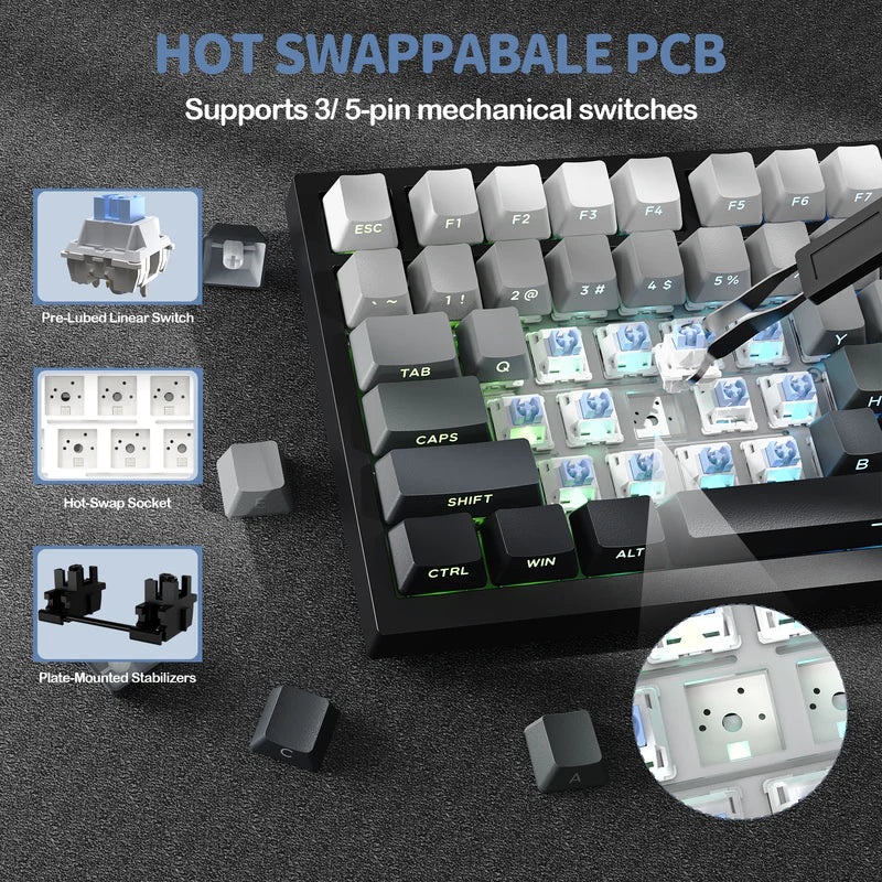 Equipped with a durable 1.2mm FR4 dual-layer PCB with individual key slotting for improved flexibility and quieter typing. Pre-lubed linear mechanical switches offer smooth, responsive keystrokes ideal for gaming and typing. Hot-swappable 3-pin and 5-pin switch sockets make it easy to customize or upgrade switches without soldering.