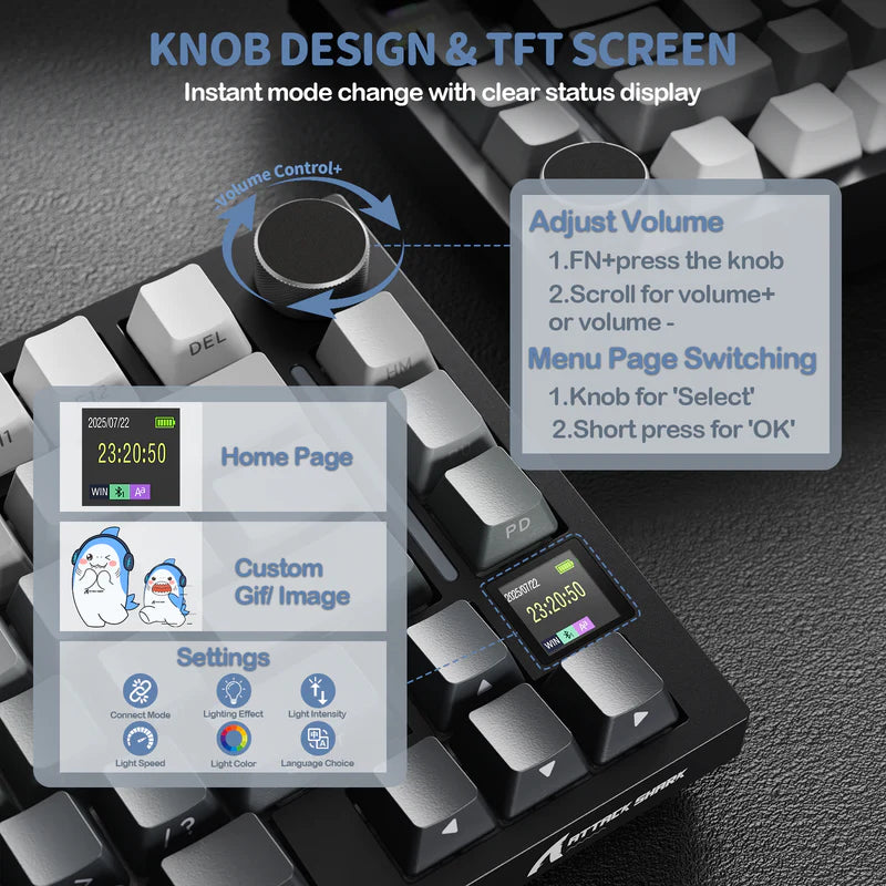 The ATTACK SHARK X820 Ultra Wireless mechanical keyboard features a smart TFT color display that shows time, battery level, connection status, and RGB backlight effects. Easily customize GIF animations via the driver. The precision CNC metal knob lets you scroll menus and press to adjust lighting brightness, speed, and system settings—making your keyboard intuitive and fun to use.