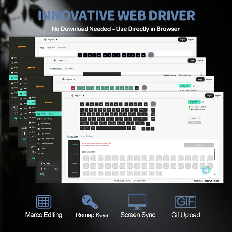The ATTACK SHARK X820 Ultra Wireless mechanical keyboard features a smart TFT color display that shows time, battery level, connection status, and RGB backlight effects. Easily customize GIF animations via the driver.