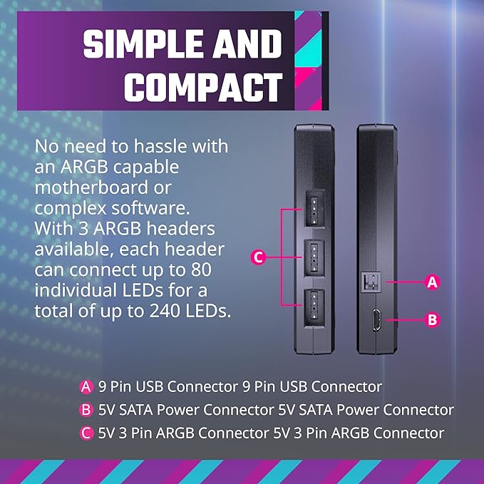 Cooler Master has engineered the new Addressable Gen 2 RGB LED Controller granting you the versatility to easily personalize your devices delivered to you in a small compact size. Together with the MasterPlus+ software, customize your Addressable Gen 2 RGB devices with individual LED color choices, lighting modes, and visual effects.