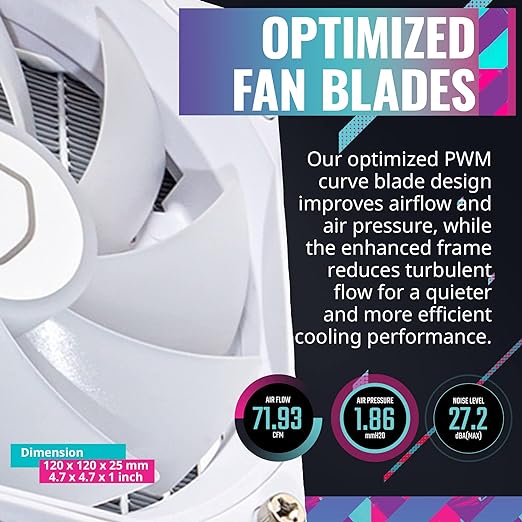 • Optimized Fan Blades: Our optimized PWM curve blade design improves airflow and air pressure, while the enhanced frame reduces turbulent flow for a quieter and more efficient cooling performance