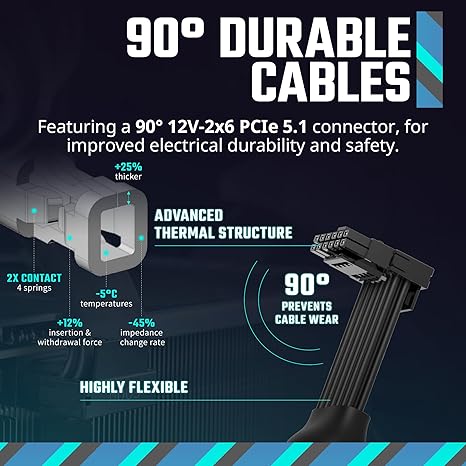 • 90° Durable Cables: Featuring a 90° 12V-2x6 PCIe 5.1 connector, for improved electrical durability and safety.