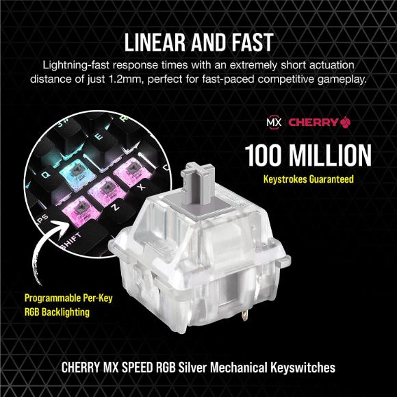 Pre-Lubed MLX Red v2 Switches: Pre-lubricated CORSAIR MLX Red v2 linear mechanical switches deliver smooth, responsive, and stable keystrokes, with enhanced ultra-bright per-key RGB backlighting