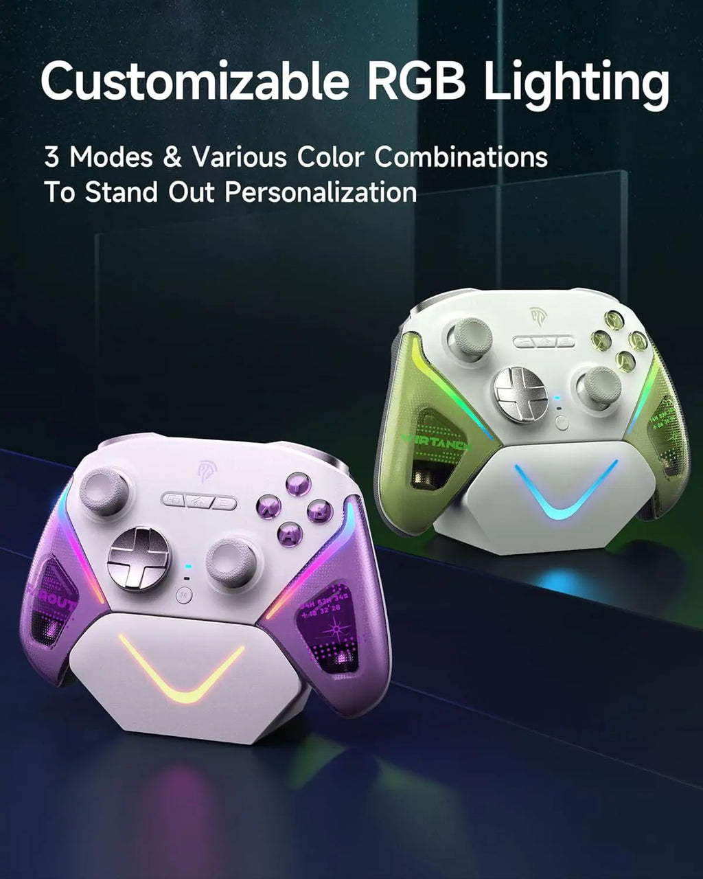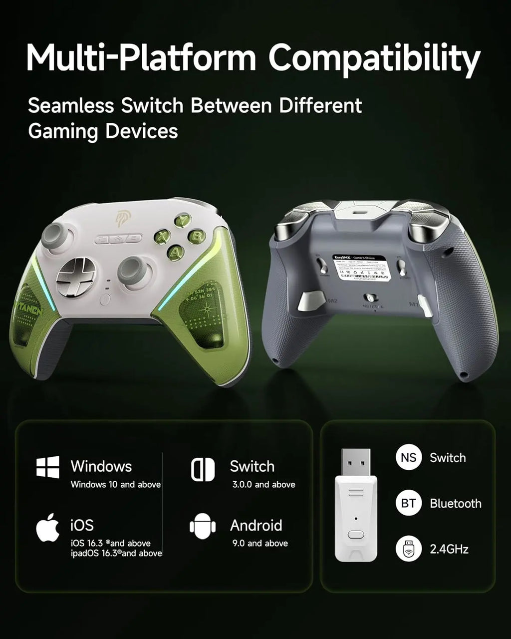 Other features for customization & pro controls: 2 Programmable Buttons; 4-Level Vibration Adjustment; 6-Axis Motion Control (on Switch); 1000mAh Battery ; Solid 1000Hz Polling Rate – Under wired & 2.4ghz wireless connection; Multi-Platform Compatibility – Play on PC, Switch, iOS, and Android with seamless performance; Customizable RGB Lighting.