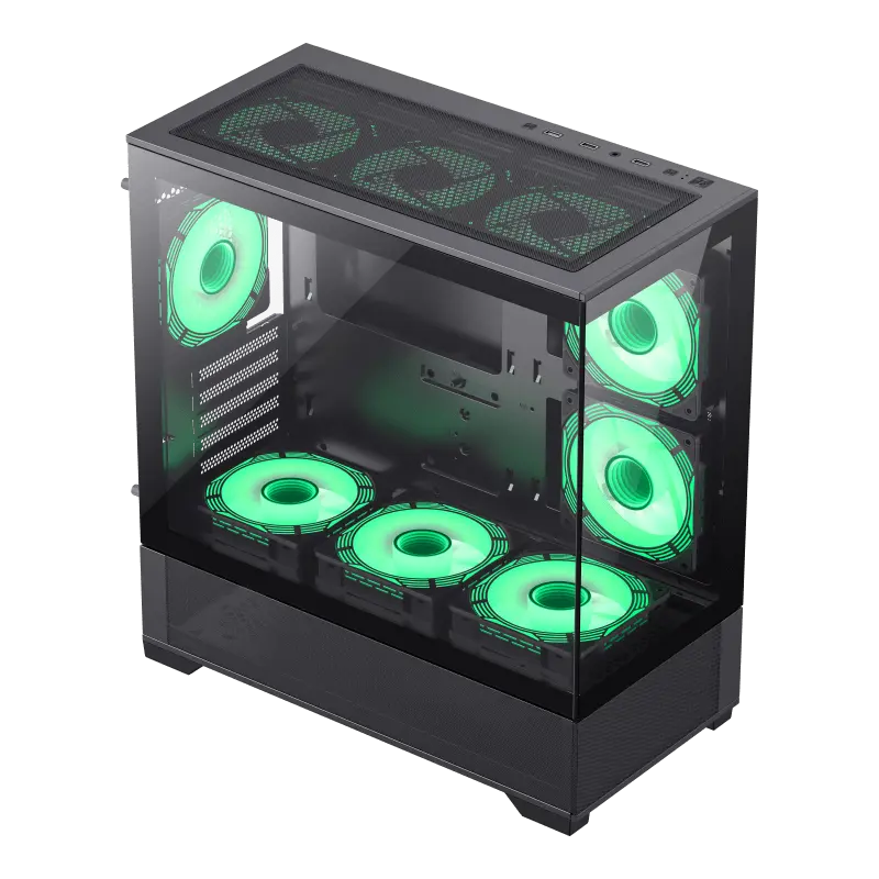 To ensure adequate airflow, a Total 9x120mm fan position, Fine mesh panel at the top, and on the PSU shroud side, help with great ventilation.