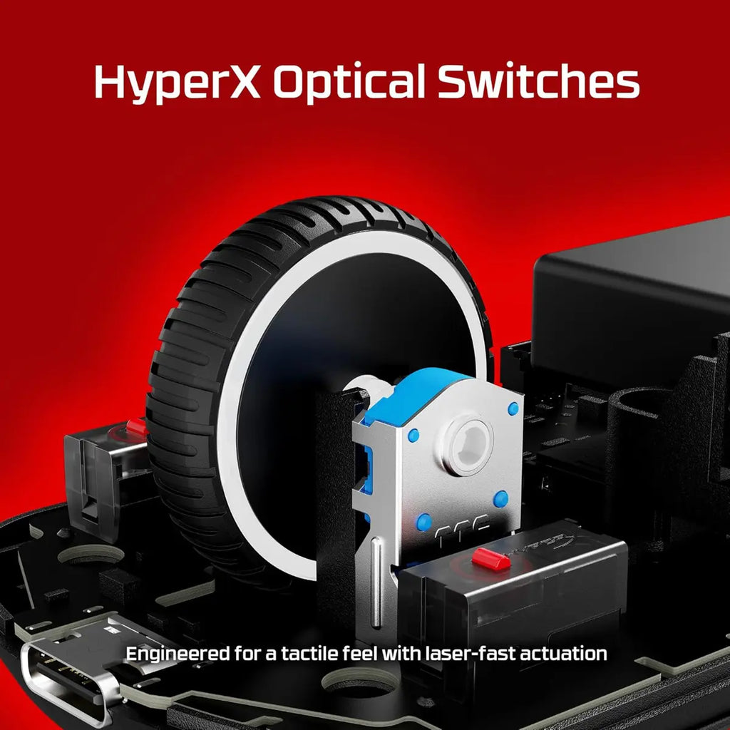 Optical Actuation with a Mechanical Feel HyperX Optical Switches combine laser-accurate actuation with a tactile feel. Optical switches capture clicks rapidly and accurately with no debounce. Click confidently with reduced input latency.