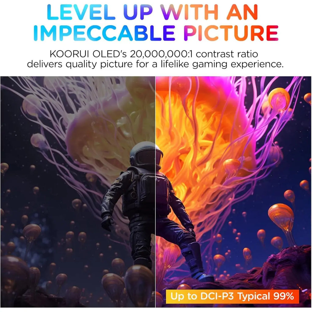 Experience ultra-sharp, lifelike images with the KOORUI S2721XO. Its 27-inch OLED screen delivers true QHD (2560x1440) resolution, deep blacks, and vibrant colors—perfect for competitive gaming and immersive entertainment.