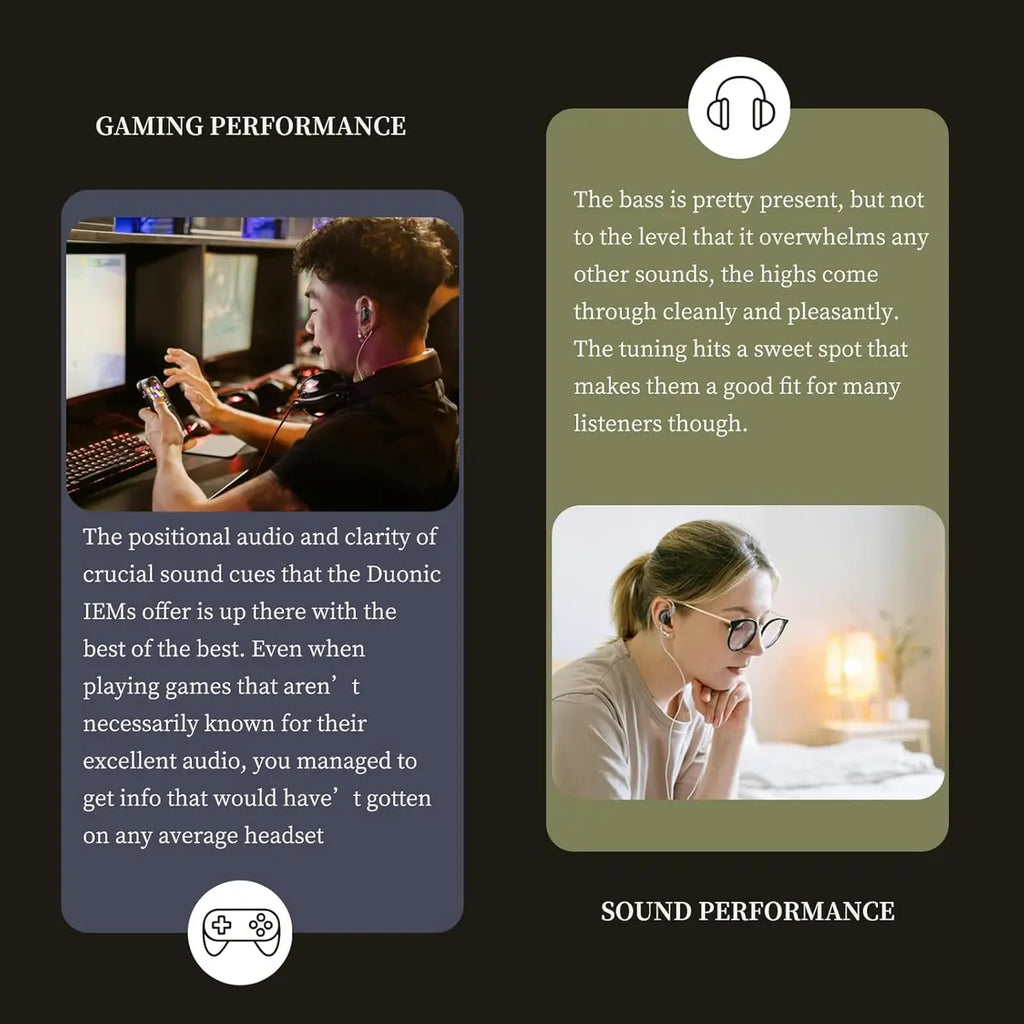 Dedicated Switch for Tuning: Duonic has 4 switches and supports user-customized sound adjustments, tonality exactly to their ears and taste. Whether in terms of tuning range, adjustment precision, or amplitude modulation, they surpass traditional damping tuning solutions by far. Clear and clean sound quality from mids and treble makes this iem earphone great ear monitors for stage and studio