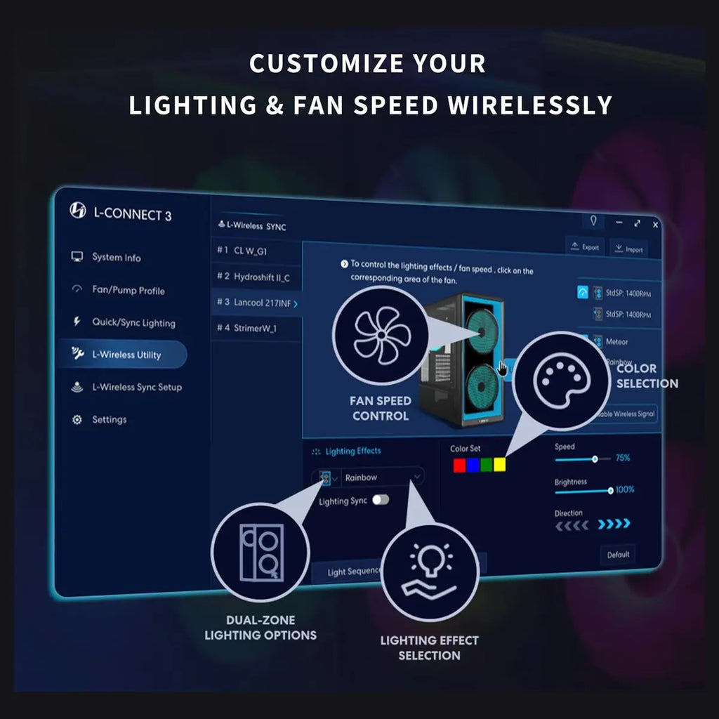 Elevate Your Build: Experience effortless lighting control with the LANCOOL 217 INFX, featuring seamless synchronization via motherboard software or wireless control for a stunning display.