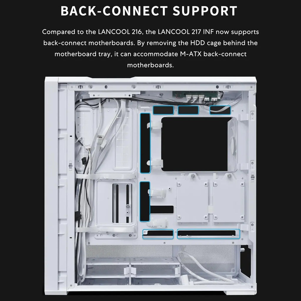 LANCOOL 217 INF continues our signature high-efficiency airflow design with an infinity mirror front panel for a striking visual effect, while dual tempered glass cutouts ensure ample airflow.