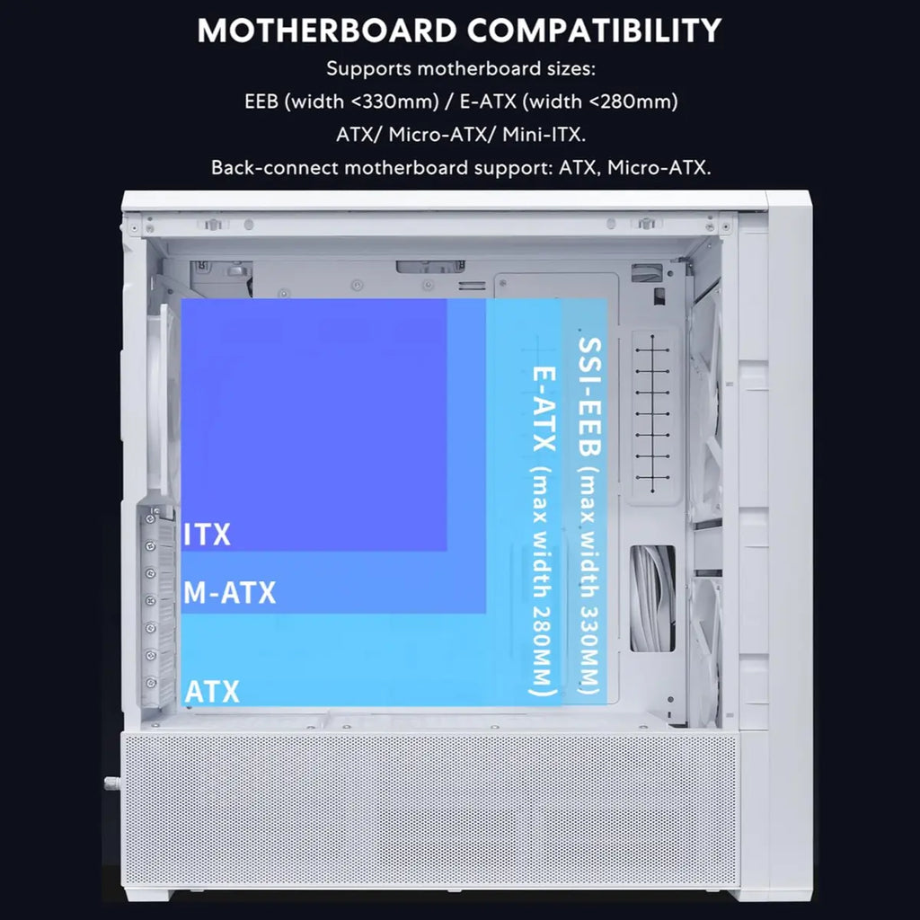 Three Pre-Installed Fans: Comes with three ARGB fans (two 170mm at the front and one 140mm at the rear) that not only enhance system cooling but also elevate the case’s visual appeal with dynamic lighting effects.