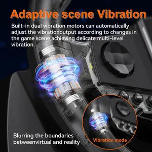 Realistic Racing Wheel Design: Built-in dual vibration motors automatically adjust vibration output according to game scenarios, providing nuanced multi-level vibrations for a more immersive driving experience. The formula-style dual paddle shifters allow for easy gear changes with just a finger slide, making you feel like you're on the track, significantly enhancing the fun of control!
