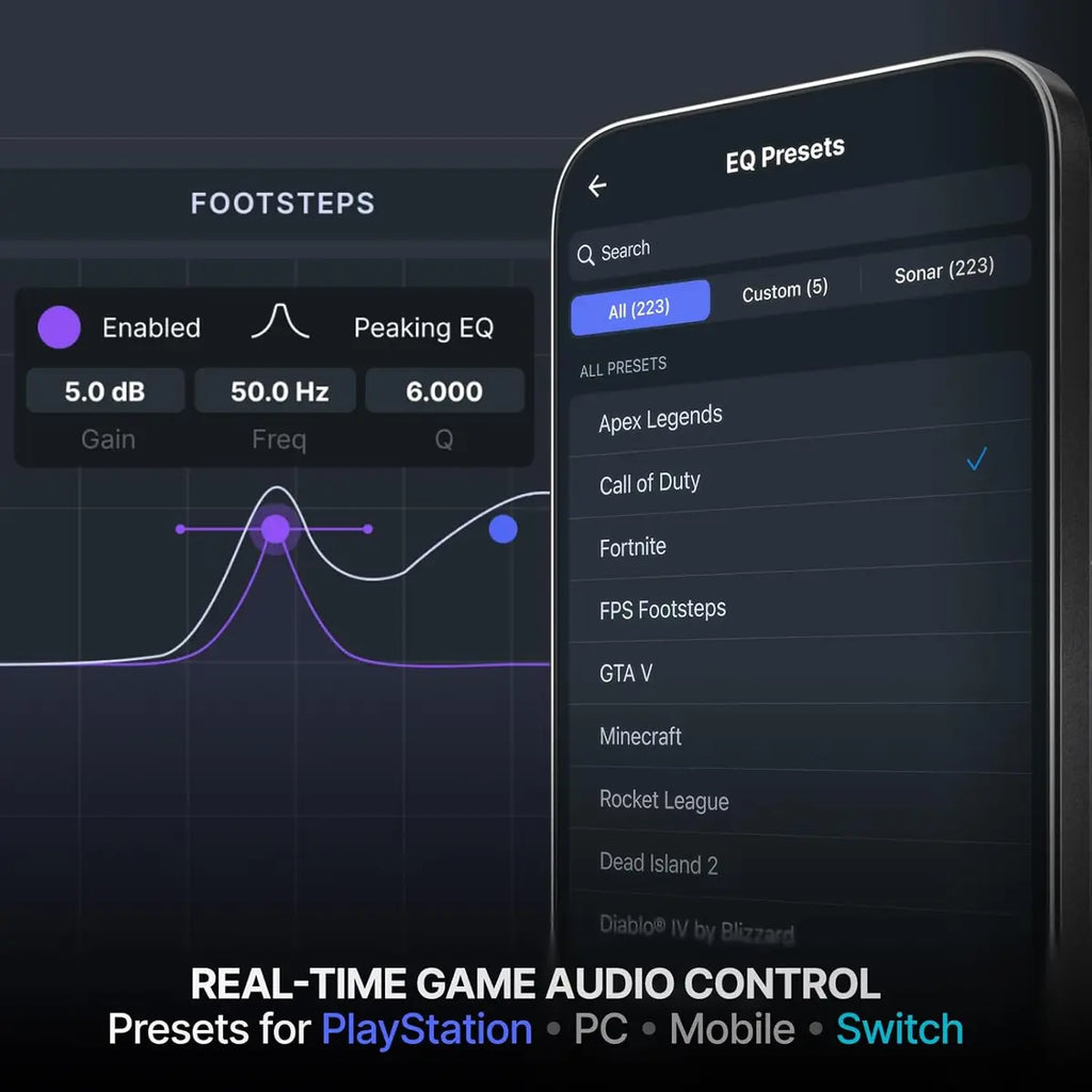 REAL-TIME GAME AUDIO CONTROL — Pinpoint enemies with what GamingTrend calls “the biggest cheat code in the industry. 200+ game specific audio presets to choose from