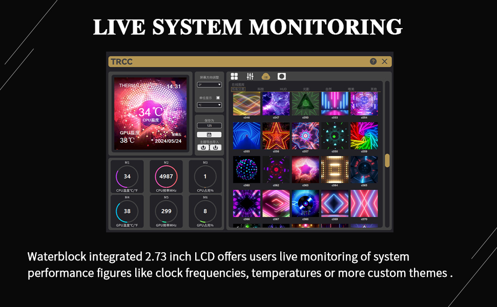 The water pump of the water-cooled cooler is a brand new generation of water pump system, which not only enhances the heat absorption efficiency, but also decreases the operation noise. Unlike ordinary water pumps, the water pump is a new IPS LCD screen, which can support DIY various static & dynamic picture switching.
