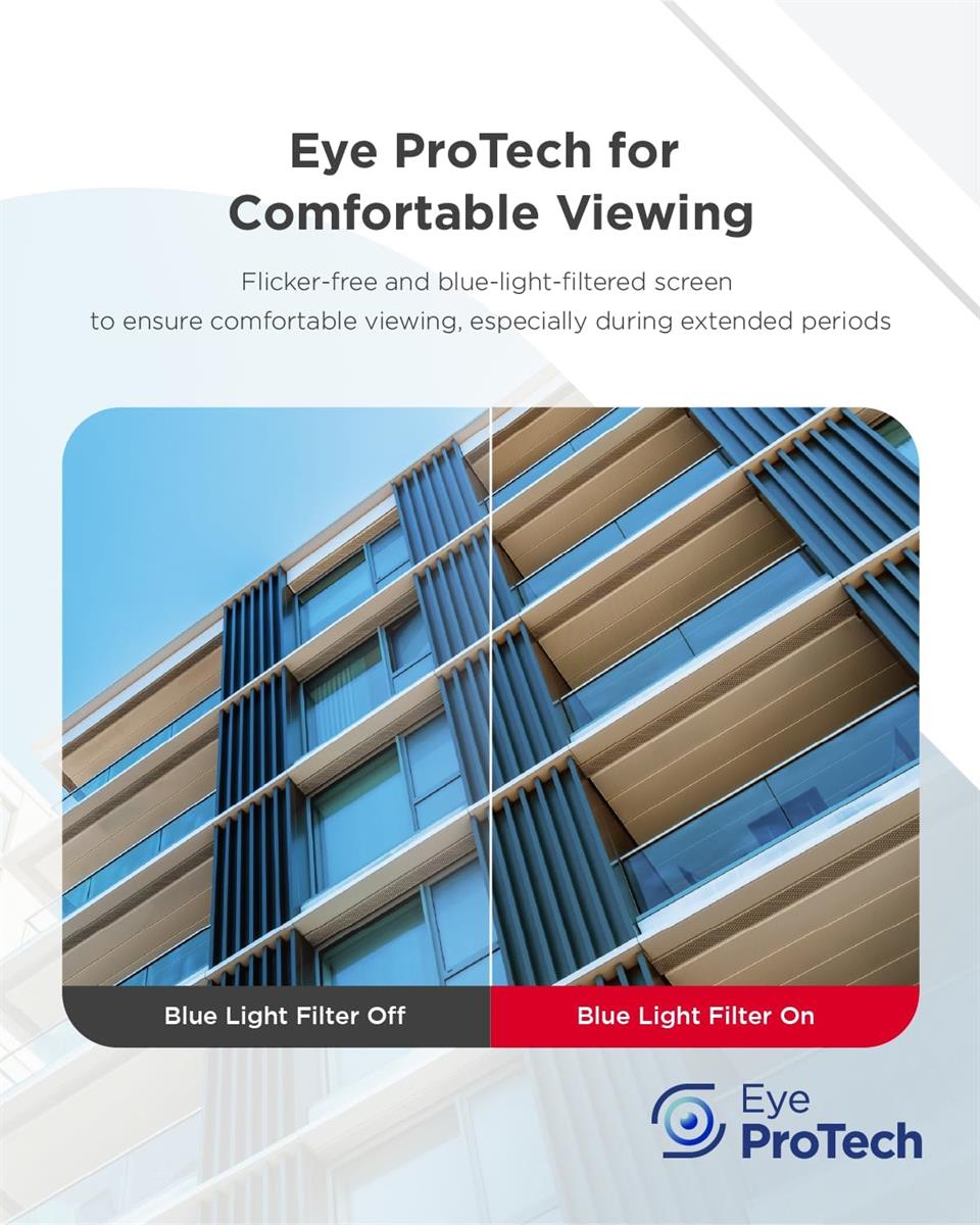 Reduce digital eye strain and maintain fresh-feeling eyes with ViewSonic Eye ProTech. The Flicker-Free technology and the blue light filter eliminate screen flickering and minimize harmful blue light emissions, ensuring comfortable screen viewing even during extended periods of use.