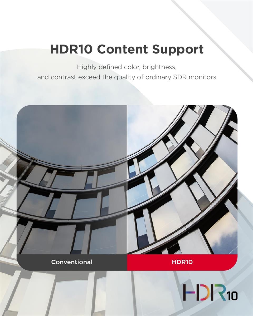 Compatible with the industry-standard HDR10 High Dynamic Range, this monitor delivers highly defined color, brightness, and contrast greatly exceeding the capabilities of ordinary SDR products.